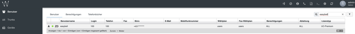 Klicken Sie auf „+ Hinzufügen“ um einen neuen Easybell-Trunk anzulegen.