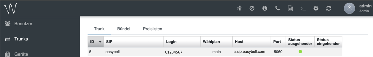 Bei korrekter Eingabe aller Angaben wird nun unter „Trunks“ der neu eingerichtete SIP Trunk angezeigt. Ein grüner Punkt am Ende der Zeile signalisiert die erfolgreich durchgeführte Registrierung.