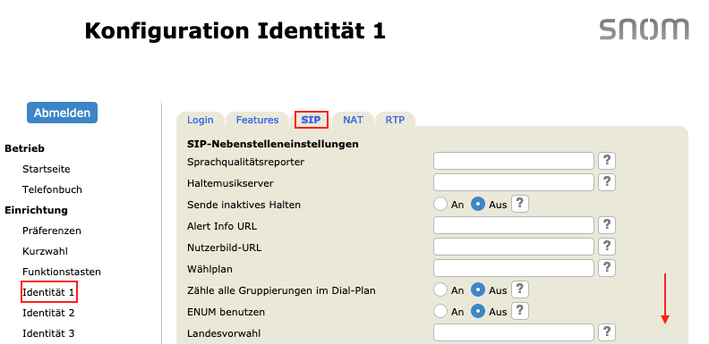 Wählen Sie nun den Reiter „SIP“ und scrollen Sie dort bitte ganz nach unten.