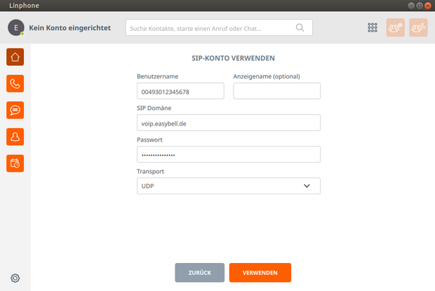 Sie befinden sich nun im Hauptfenster von Linphone. Oben links sollten Sie bereits an dem grünen Haken erkennen, dass die Rufnummer registriert ist.