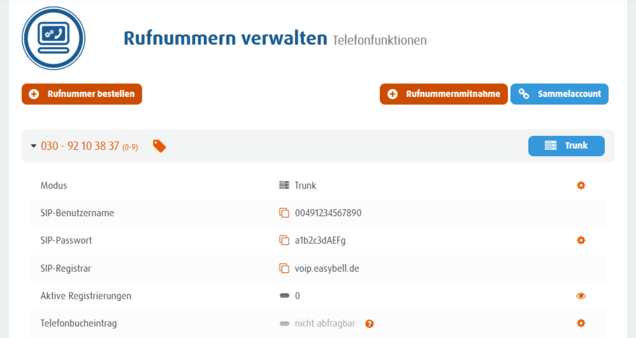 SIP-Zugangsdaten: Im Kundenportal unter „Telefonfunktionen" im Bereich „Rufnummern verwalen“. Klicken Sie auf den jeweiligen SIP Trunk um die Verbindungsdetails anzuzeigen.