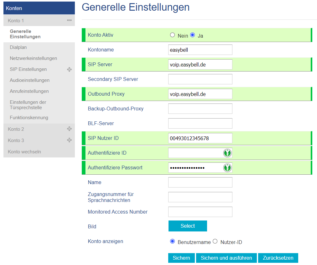 Sie können im Telefon mehrere SIP-Accounts parallel einrichten. Um bspw. das erste Konto zu bearbeiten; klicken Sie bitte in der Menüleiste auf Konten → Konto 1 → Generelle Einstellungen.
