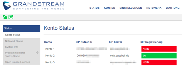 In der Übersicht der Verbindungen (Status → Konto Status) sehen Sie nun, dass bei einem der Konten der Registrar und der SIP-Benutzername angezeigt werden. Wenn alles richtig eingerichtet ist, steht bei „SIP Registrierung“ nun „JA“.