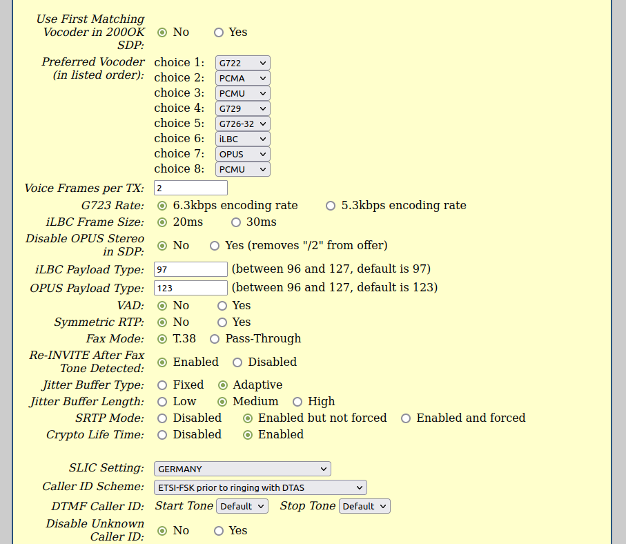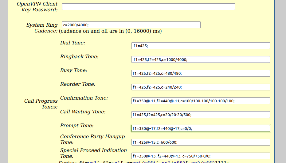 Rufen Sie nun bitte die „Advanced Settings“ auf und tragen Sie dort unter „Call Progress Tones“ die Werte aus der folgenden Tabelle ein.