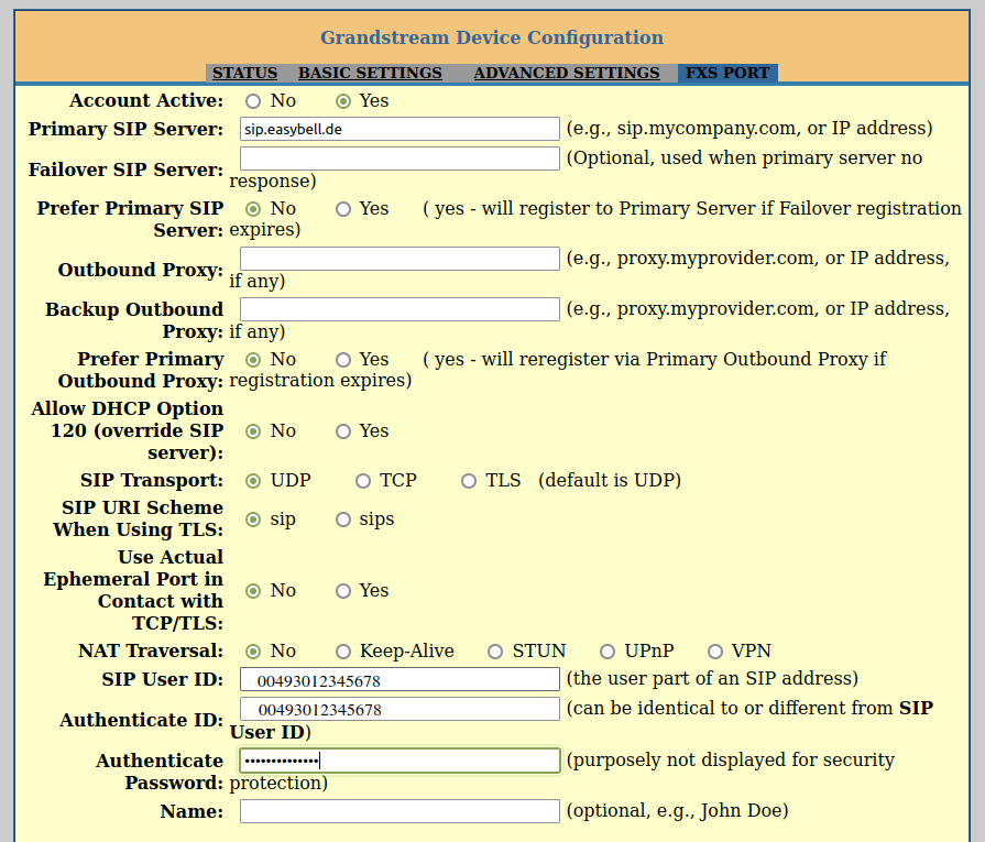 Tragen Sie Ihre SIP-Zugangsdaten in die entsprechenden Felder ein: