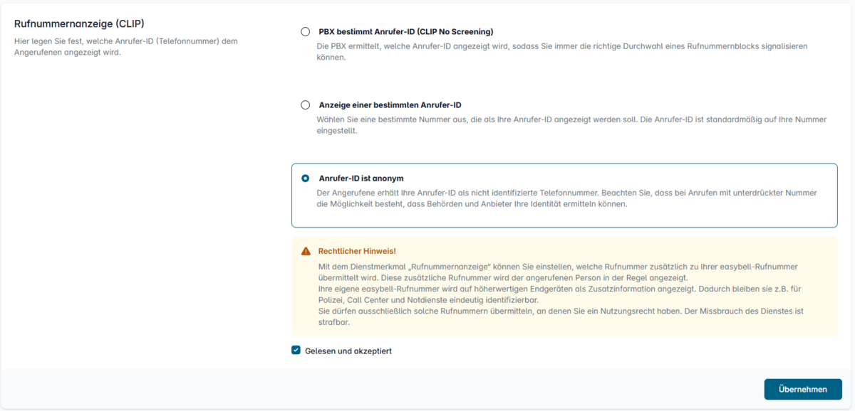 Es öffnet sich ein Fenster. Wählen Sie im Bereich „Rufnummernanzeige (CLIP)“ nun „Anrufer-ID ist anonym“.