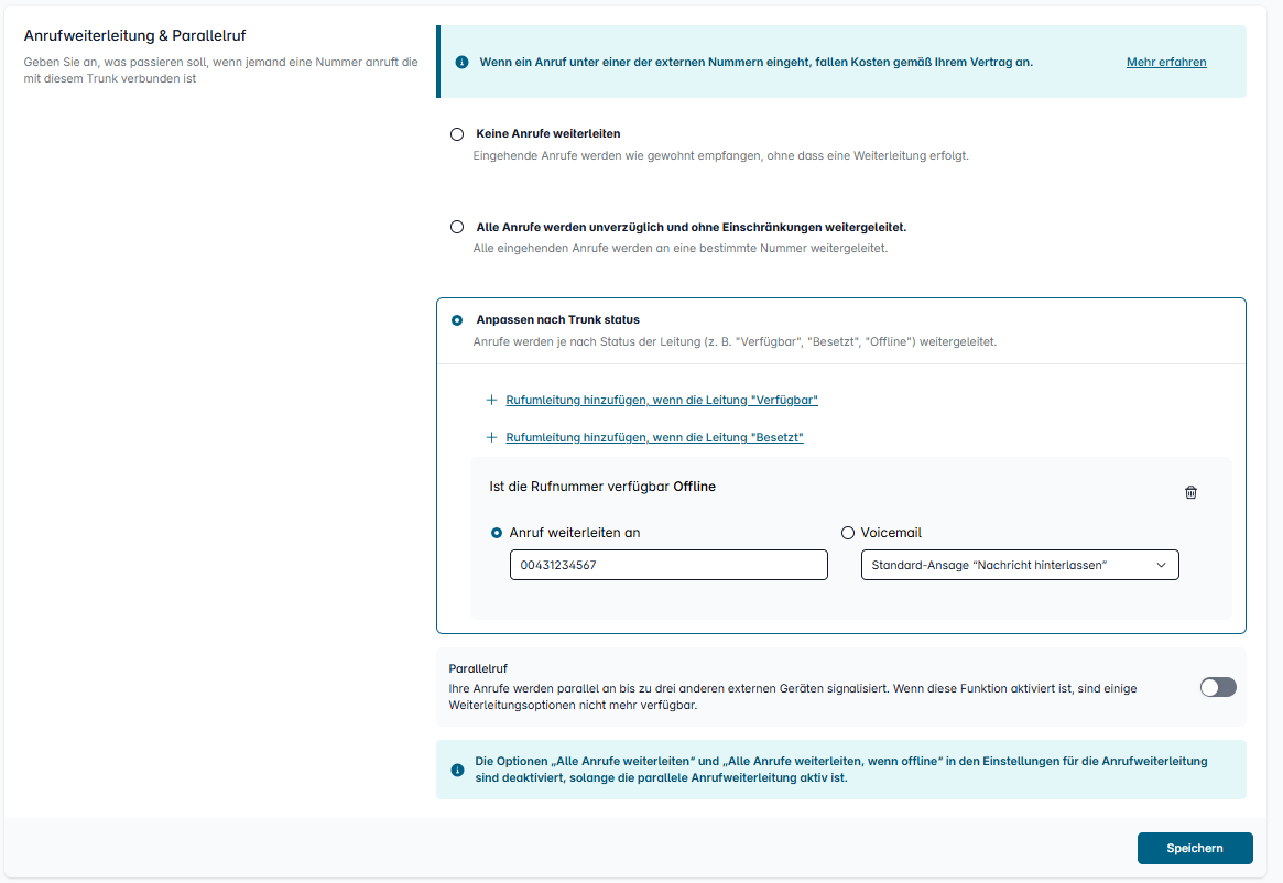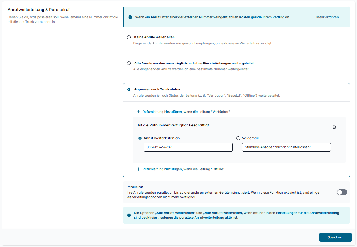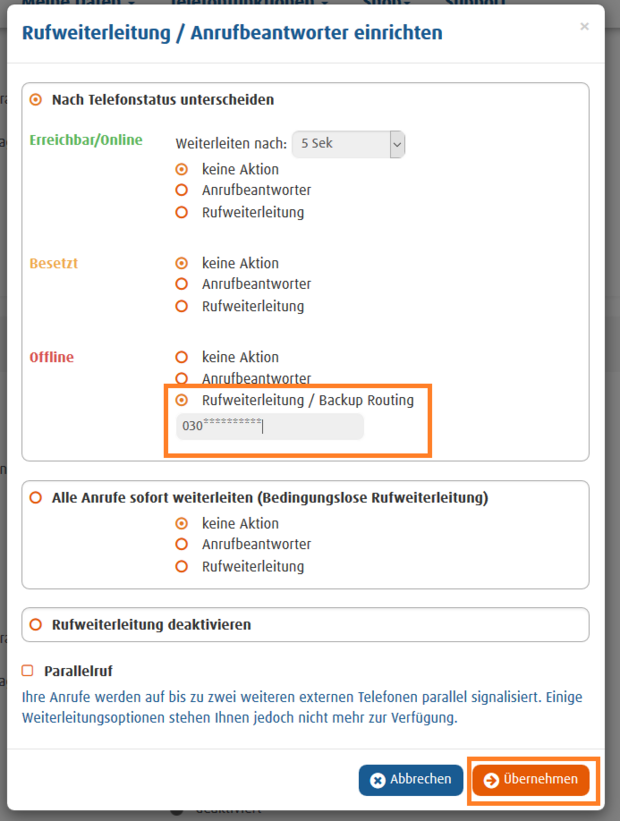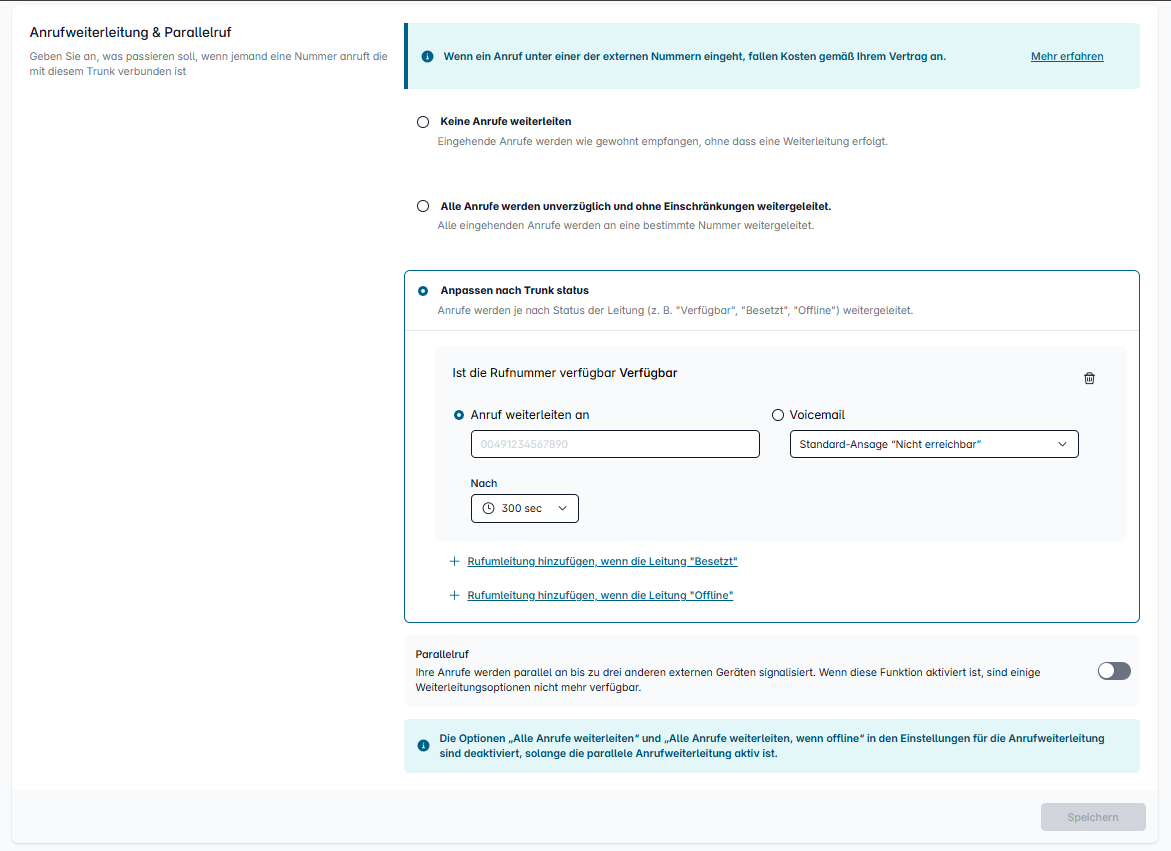 - Weiterleitungen, die Sie dauerhaft nutzen wollen, sollten Sie im Kundenportal einrichten. Dies sind beispielsweise ihr Anrufbeantworter oder auch ein Fallback-Routing. Mehr dazu lesen Sie in diesem Artikel.