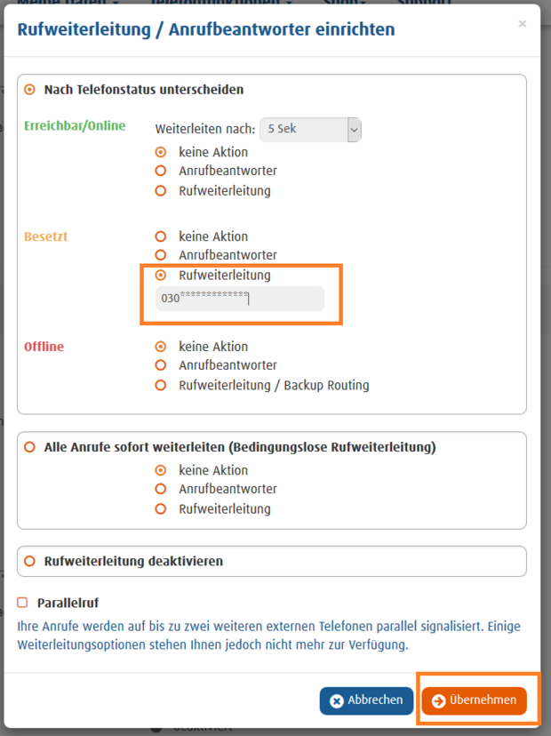 Ihre Rufweiterleitung wurde erfolgreich aktiviert.