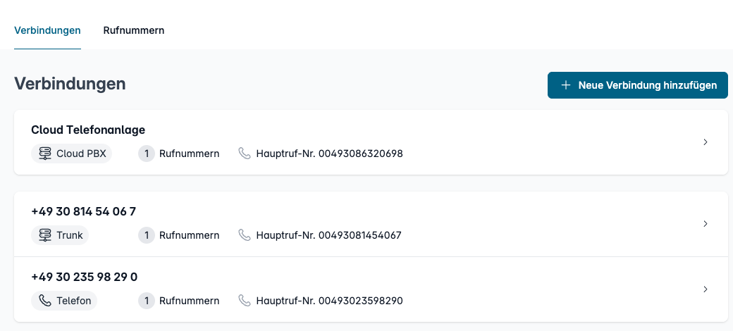Unter „Telefonfunktionen“ → „Rufnummern verwalten“ finden Sie unter „Verbindungen“ eine Übersicht Ihrer SIP Trunks.