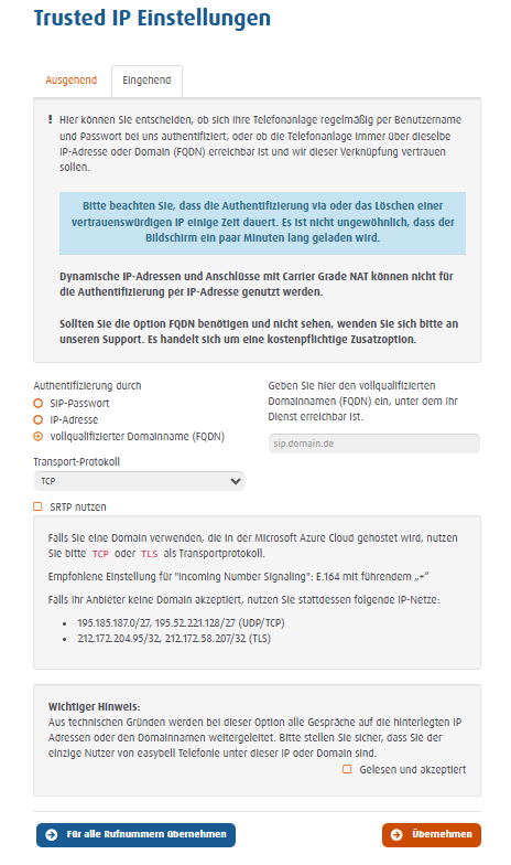 Authentifizierung per FQDN (Domain) für SIP Trunks einrichten