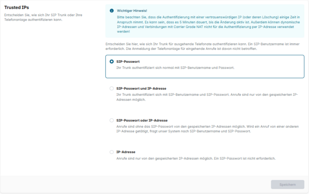 Bei ausgehenden Verbindungen können Sie sich entscheiden, ob Sie Trusted IP als zusätzliche Absicherung zur klassischen Registrierung über SIP-Zugangsdaten nutzen wollen, oder ob die Authentifizierung ausschließlich IP-basiert stattfinden soll.